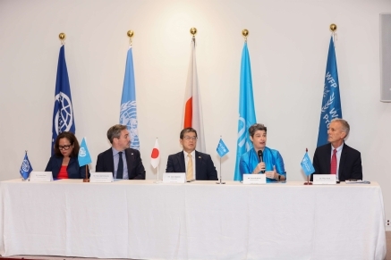 Following the meeting with Hon. Minister Herath, Ambassador ISOMATA held a media briefing session together with Mr. Marc-André Franche, United Nations Resident Coordinator, Ms. Kristin Parco, Chief of Mission of IOM, Mr. Philip Ward, Representative of WFP and Ms. Emma Brigham, Representative of UNICEF. The briefing session highlighted Japan’s comprehensive assistance and its close collaboration with the United Nations system in supporting the people of Sri Lanka in need.